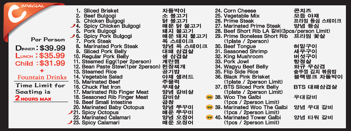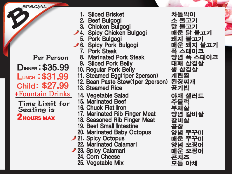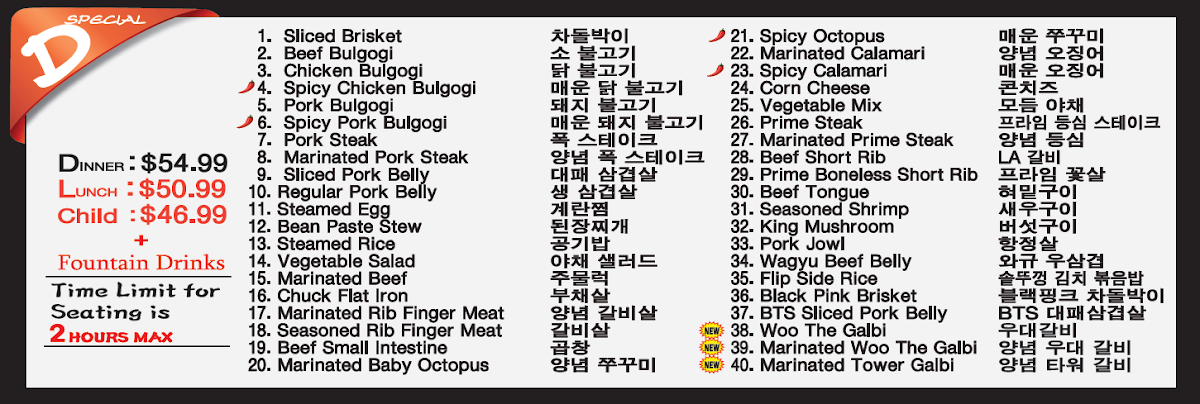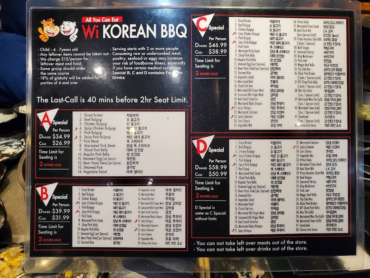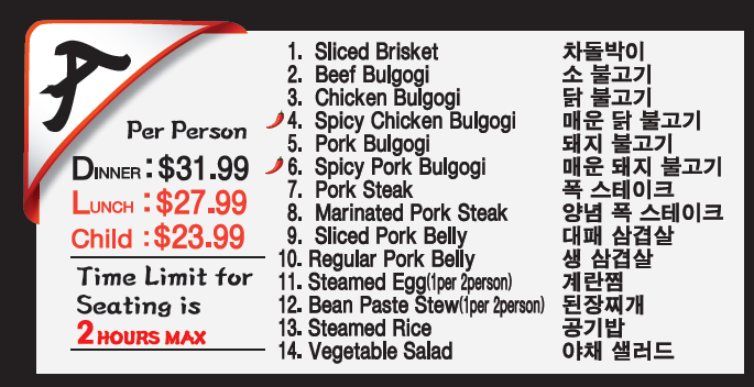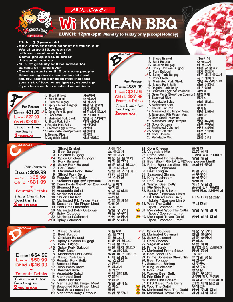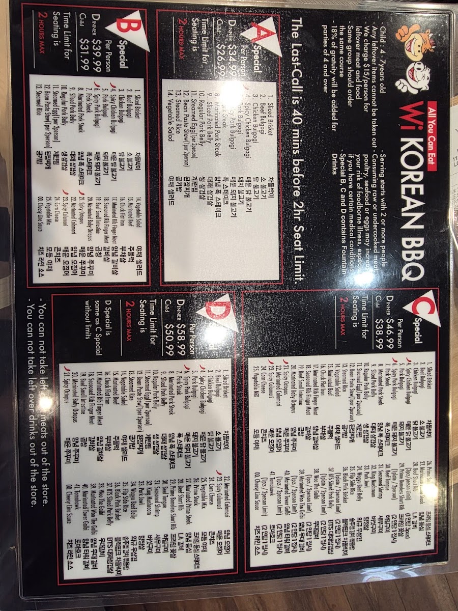 The menu is suitable for casual dining occasions, with options designed for group sharing and extended meals centered around Korean barbecue preparation. Lunch specials provide an accessible choice for midday dining, while the all-you-can-eat options accommodate longer visits. Its structure supports an interactive dining experience that typically involves grilling meat at the table accompanied by shared side dishes and drinks.