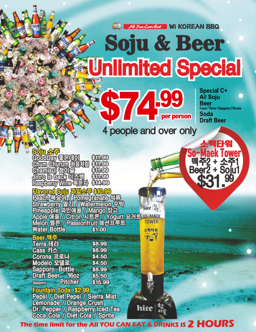 - Drinks: A selection of beverages including several brands of Soju, flavored soju varieties, Korean and international beers (Terra, Cass, Sapporo, Corona, Modelo), raspberry wine, soda, and soju cocktail mixes.